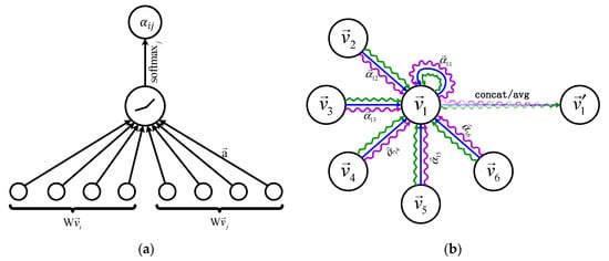 (a) The calculation process of attention coefficient; (b) the calculation process of hidden layer features.