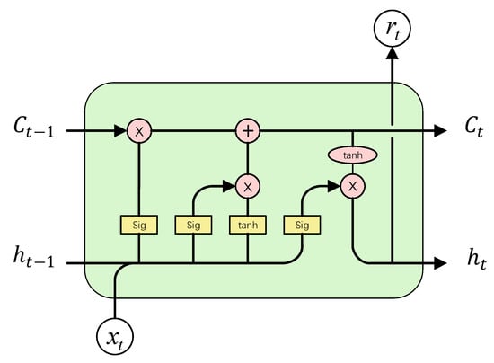 LSTM is a special type of recurrent neural network (RNN) architecture used for processing and predicting sequence data []. It uses gate mechanisms to better capture long-term dependencies in time series data, making it better suited for handling such data. An LSTM network consists of a series of LSTM cells, each containing an input gate, a forget gate, and an output gate. The input gate and forget gate are used to control the flow of information, with the input gate determining which information should be updated in the memory cell and the forget gate deciding which information should be discarded from the memory cell. The output gate determines how much influence the memory cell should have on the current output. The core cell unit of LSTM is shown in Figure 5.