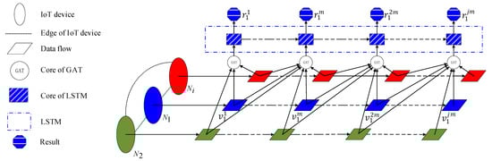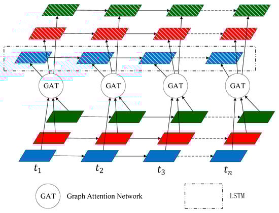 The STGAT mentioned in [] is an actual application of STGNN. It combines the derived form of GNN, called GAT, with LSTM for human trajectory prediction. The fusion process is illustrated in Figure 6. The core method of combining the two is to use Graph Attention Networks (GAT) to aggregate neighbor node information without altering the temporal order. The fused information is then used as the input to the LSTM. In Figure 6, can represent both the time sequence and the preceding or succeeding positions. In this article, the improved version of STGAT is applied to training and recognition in network intrusion detection.