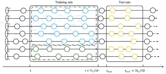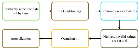 The source IP address groups the dataset, and the time sequence of the data sorts each group flows. In this way, the dataset comprises thousands of chains of data flows. The data from time to is selected as the training dataset, and the data from to is selected as the testing dataset, as shown in Figure 10. Useless features such as IP addresses and ports are removed. There are also some invalid and empty values in the dataset, which are set to 0. Since the values of some fields in the dataset have an extensive range, quantification is needed. Finally, the remaining fields are normalized using L2 normalization.