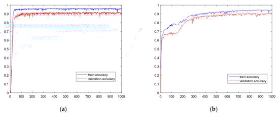 The training accuracy changes for multi-class classification on different datasets are shown in Figure 11. The training accuracy of dataset NF-BoT-IoT-v2 quickly reached 90% before 20 epochs and remained stable above 95% after 100 epochs. Its validation accuracy was lower than the training accuracy throughout the entire training process but also stabilized above 92% in the end. The training accuracy of dataset NF-ToN-IoT-v2 was slightly lower than that of dataset NF-BoT-IoT-v2, with continuous growth before 600 epochs and stability above 93% after 700 epochs. The validation accuracy was also lower than the training accuracy throughout the entire training process but stabilized above 90% in the end.