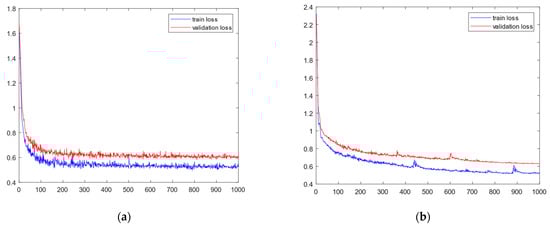 The cross-entropy loss during the training process for multi-classification on different datasets is shown in Figure 12. For the dataset NF-BoT-IoT-v2, the training loss rapidly decreased to 0.6 before 100 epochs and stabilized around 0.4 after 200 epochs. The validation loss was higher than the training loss throughout the training process but also stabilized at about 0.7 in the end. For the dataset NF-ToN-IoT-v2, the training loss was slightly worse than that of NF-BoT-IoT-v2, and it continued to decrease before 600 epochs and then stabilized at 0.4 after 700 epochs. The validation loss was higher than the training loss throughout the training process but stabilized at 0.6 in the end.