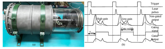 The system controller triggers the 532 nm laser to emit laser pulses at a frequency of 5 kHz. A gating signal with the same repetition rate is then applied to activate the PMT2, enabling it to detect the incident light. Users can alter the gate width and delay time of the gating signal by sending commands to the system controller. The system controller also implements the synchronized acquisition of experiment data from all four channels. Figure 4 presents the prototype of the MUL system and the corresponding timing sequence diagram. The LiDAR system has a waterproof housing made of aluminum alloy, providing high-pressure resistance for underwater operation at depths of up to 100 m. The overall size of the prototype is 260 mm in diameter and 650 mm in length, with a weight of roughly 30 kg.