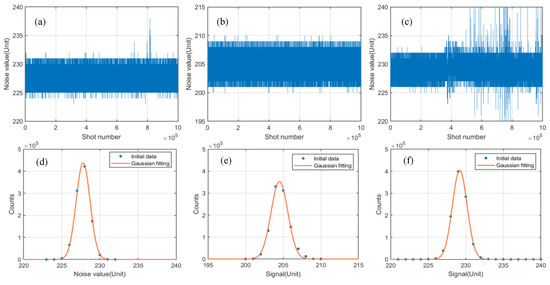 The detection noise in the Lidar system is the combination noise of detector noise, amplifying circuit noise, and quantization noise. Figure 5a–c illustrate the superposed detection noise measured by the three detection channels (CH1, CH2, and CH3) in dark surroundings. The distribution of the noise measured by each channel is presented in Figure 5d–f, as well as the observed noise obeys the Gaussian distribution. It should be noted that each channel exhibits a distinct noise bias, which does not influence the overall noise distribution and can be corrected during the data processing procedure.