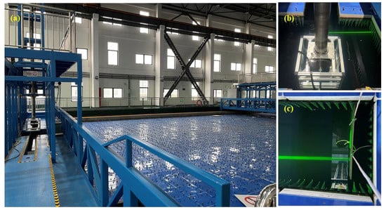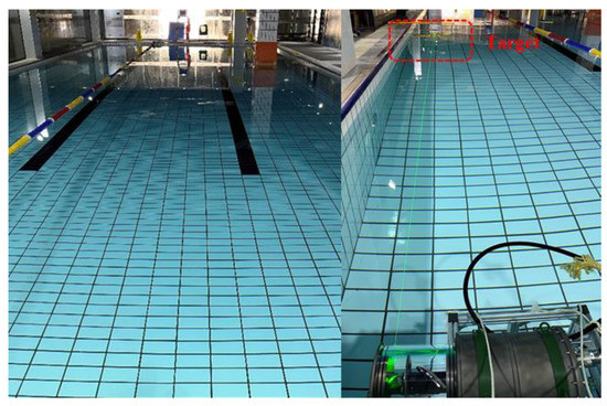 To assess the range accuracy of the system and to verify the reliability of the proposed simulation method, underwater detection experiments were undertaken on 1 December 2022. The experimental site was an anechoic pond at the Shanghai Acoustics Laboratory, Academia Sinica (ACS). The in situ water body parameters were collected by the WETLabs acs instrument, which recorded an attenuation coefficient (c) of 1.44 m−1 and an absorption coefficient (a) of 0.22 m−1 at 532 nm. The prototype and the target were submerged in the water and positioned on both sides of the pond. The target was a black-painted rectangular aluminum plate with a reflectance of 0.1. The distances between the prototype and the panel were adjusted at 8.5 m, 10.0 m, and 11.5 m accordingly. Figure 6 displays the photographs of the experimental scenario and the target.
