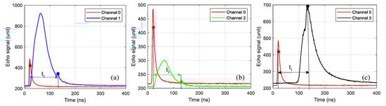 The measured four-channel Lidar waveforms and peak detection results are displayed in Figure 7a–c. Channel 0 serves as the reference signal for monitoring the emitted laser pulses, channel 1 is the near-field high-gain channel, channel 2 is the near-field low-gain channel, and channel 3 is the far-field gated channel. The time interval value between the peak of reference channel 0 and the target peaks in channels (1–3) is determined by utilizing the peak detection methods [45]. The corresponding range value Ri of different detection channels can be represented as follows according to the TOF principle: