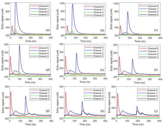 As demonstrated in Figure 10a–i, the signal level in the near-field high-gain channel 1 is greater than that in the near-field low-gain channel 2, as a result of the signal splitting mechanism. In the case of measuring a target at a distance of 3 m, the reflected signal from the target is strong, resulting in partial saturation in the target echo in high-gain channel 1, as shown in Figure 10a. Yet, the low-gain channel 2 preserves the complete waveform shape of the target echo. As the test distance increases, the intensity of the target peak in channel 2 becomes less noticeable, while the target echo peak in channel 1 remains significant. Therefore, the employment of both high- and low-gain channels can broaden the dynamic range of near-field detection and also permit more precise distance measurement.