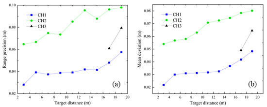 The measured distance data were obtained by extracting the target peak using the same methods employed in the anechoic pond verification experiment discussed in Section 4.2. Figure 11 presents the range precision and mean deviation of detection channels 1–3 at varying target positions. For each channel, range accuracy decreases as the distance of the targets increases yet remain better than 0.10 m. Notably, selecting the data of the detection channel with the highest range accuracy, specifically CH1, can lead to even more precise range measurement, with a range accuracy better than 0.06 m. Figure 11b reveals deviations between the measured distances and the actual distances, which are amplified with an increase in distance due to the pulse width of the laser and potential errors in the data processing. This bias may be mitigated through the utilization of advanced waveform processing algorithms and range correction algorithms.