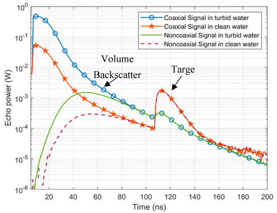 The overlap factor, as explained in Section 2.2.1, is a crucial factor that determines the signal strength of returning Lidar echo. To study the influence of transceiver geometric configuration on return signals under different turbidities, return signals with coaxial and non-coaxial structure under different turbidities were simulated using the identical system parameters from Table 1, as shown in Figure 13. The power of the light scattered back from suspended particles to the Lidar system is affected by the overlap factor and water attenuation. In the near field, the geometric overlap factor has a more significant impact on the backscattering signal intensity, resulting in an increase in the signal. As the distance increases, the backscattering signal is primarily influenced by the attenuation of water, and the signal level decays exponentially. Thus, the non-coaxial Lidar signals first increase and then exponentially decline.