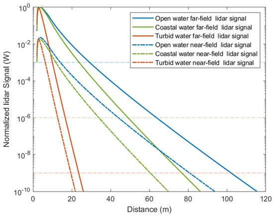 To access the maximum detectable range of underwater targets with a reflectance of 0.1 using different detecting channels, we simulate the normalized Lidar signal of various channels for three distinct types of marine conditions [40]. These simulations were performed using the same systematic parameters as those presented in Table 1. The simulation results in Figure 14 show that the slope of signal attenuation is related to the optical properties of the seawater, with faster signal attenuation in more turbid water. In this work, the far-field channel signal is detected by a range-gated detector, and the gate-open time can be adjusted by the user when they observe the signal from the near-field becomes undetectable.