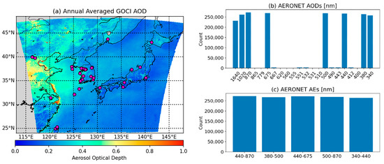(a) Annually averaged geostationary ocean color imager (GOCI) aerosol optical depth (AOD) in 2016 and locations of the aerosol robotic network (AERONET) stations (purple circles). The number of data points of (b) the AOD and (c) the Ångström Exponent (AE) in the year of 2016 over the GOCI observation area.