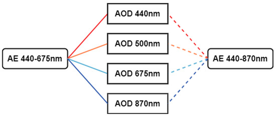 The AE indicates a spectral dependence of aerosol extinction and is calculated from AODs at different wavelengths using Equation (1). The AE is inversely related to the aerosol particle size [39] and is commonly used to interpolate or extrapolate AODs for a desired wavelength [40]. Equation (2) allows AOD calculations to be made for a desired wavelength band (in this case, 550 nm) when AOD λ and AE α are available [15,25,41].