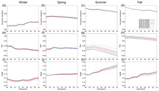 Seasonal analysis of the validation results of GOCI AODs at 550 nm using AERONET AODs at 550 nm based on the collocation radii in (a,e,i) winter (December–January–February), (b,f,j) spring (March–April–May), (c,g,k) summer (June–July–August), and (d,h,l) fall (September–October–November) in the year of 2016.