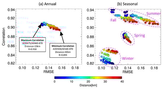 Scatter plots of the correlation coefficient (R) and root mean square error (RMSE) between the GOCI and AERONET AODs at 550 nm, colored by collocation radii for (a) annual and (b) seasonal results in the year of 2016.