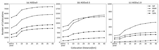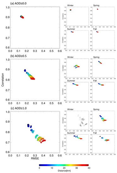 The analysis of seasonal differences was conducted using the same approach. First, the number of collocations collected for each season was examined. Figure 8 shows the number of AERONET and GOCI collocations depending on the collocation radii of up to 40 km, representing the seasonal count number of collocations for all AODs, AODs ≥ 0.5, and AODs ≥ 1.0. In all seasons, the number of collected collocations increased as the collocation radii increased. Notably, the higher the AOD, the higher the number of collocations observed in the summer than in the spring, suggesting that high-concentration aerosols were most frequently observed in the summer of 2016 when the KORUS-AQ campaign was conducted. Eck et al. [36] showed that the highest AOD days were observed on the cloudy and foggy days associating with the high humidity in the Yellow Sea during the campaign period. Furthermore, during the winter, a minimum of seven and a maximum of fifty-five collocations were observed for the total collocation radius when the AOD ≥ 1.0 (Figure 8c). However, as the sample size was not statistically significant, statistical values calculated with samples <100 were denoted with unfilled dots in Figure 8. Based on the distribution of these seasonal statistics by the concentration and season, R decreased, and the RMSE increased in all seasons when the AOD ≥ 1.0, with the range of R and RMSE expanding more widely than when the AOD ≥ 0.5. In spring, the variance increased for each wavelength combination as the collocation distance increased compared to the other seasons. In contrast, for the summer and fall, the difference in the RMSE was more significant than for the difference in each wavelength combination depending on the collocation radii.