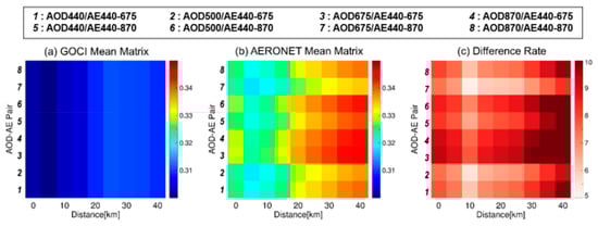 First, we compared the average AOD values for each pair of GOCI and AERONET used in the comparison and for each collocation radius. Figure 9c shows the difference rate between the average GOCI AOD (Figure 9a) and the collocated AERONET AOD (Figure 9b). This was obtained by calculating the percentile of AERONET AOD compared to the GOCI AOD for each wavelength combination and collocation radius. Fluctuations were observed depending on the wavelength and collocation radius, ranging from a minimum of 5.18% to a maximum of 11.73%, respectively. Overall, the difference in the GOCI value increased as the collocation radius increased. The smallest difference was observed in AOD675/AE440-870 at a collocation radius of 10 km, while the largest difference was noted in AOD675/AE440-675 at a collocation radius of 40 km, respectively. At high concentrations, the difference fluctuated from −2.28% to 15.56% for AODs ≥ 0.5, and from −6.64% to 19.51% for AODs≥ 1.0, respectively.