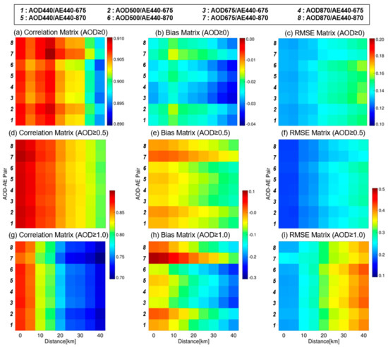 Figure 3 shows the spatial and spectral dependencies in the validation results of the GOCI AODs at 550 nm using the AERONET AODs at 550 nm in 2016. The spatial collocation of the satellite data was performed by averaging them over pixels within the radius from 0 to 40 km with a spatial interval of 5 km from the AERONET station. A search radius of 0 km indicates the use of one pixel of the satellite data where the AERONET station is located.