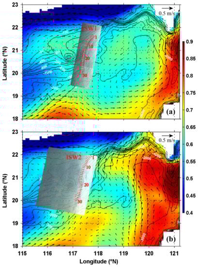 ENVISAT is an advanced polar-orbiting earth observation satellite, which provides measurements of the atmosphere, ocean, land, and ice. The advanced synthetic aperture radar (ASAR) on board this satellite operates at C-band. Due to higher sensitivity to variations in sea-surface roughness, ASAR data were acquired using VV polarization. ISWs can be seen clearly in ASAR images that have 75 m pixel spacing. Two SAR-observed ISWs (ISW1 in Figure 1a and ISW2 in Figure 1b, as adopted by Xie et al. [] and Wang et al. []) near Dongsha Atoll of the NSCS at a water depth of 400–1400 m were captured on 20 July 2007 and 18 June 2008, respectively. In two images, the long ISW front propagating from generation source sites at the Luzon Strait and across the deep basin, while not reaching Dongsha Atoll, were both observed between 117 and 118°E. Furthermore, 30 transects (the red lines in Figure 1) approximately parallel to the wave-propagation direction were selected to analyze the variations in ISW characteristics along the wavefront in each SAR image. For each ISW, the intersection point of the wavefront and each transect were taken as its location. Their corresponding locations of two ISW fronts in our study region (20–22°E, 117–118°E) are presented in Figure 2. Figure 2 also reveals how the ISWs propagate regarding the background currents (see red and black arrows, respectively). Furthermore, the normalized radar cross-sections (NRCS) of ISWs along each transect was averaged in the direction perpendicular to the wave-propagation direction. Then, wave half-width can be obtained by the horizontal distribution curve of pixel backscattering intensity values (averaged NRCS).