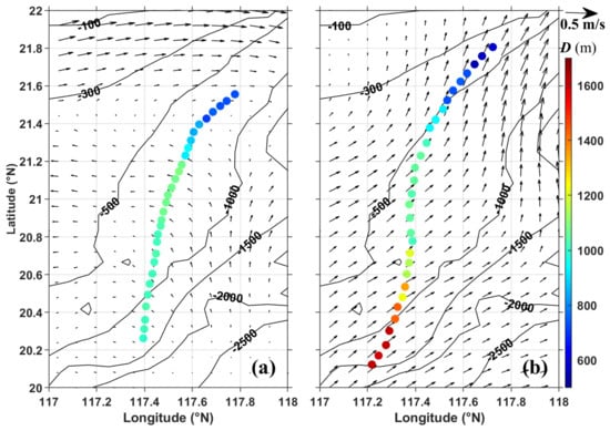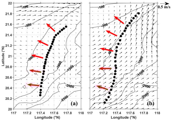 Locations of two westward or northwestward propagating ISW fronts (filled circles) acquired on 20 July 2007 (a) and 18 June 2008 (b) in the NSCS and the contemporaneous background variations indicated by the surface current (black arrows); thin black lines depict water depth (m); thick red arrows represent the wave-propagation direction.