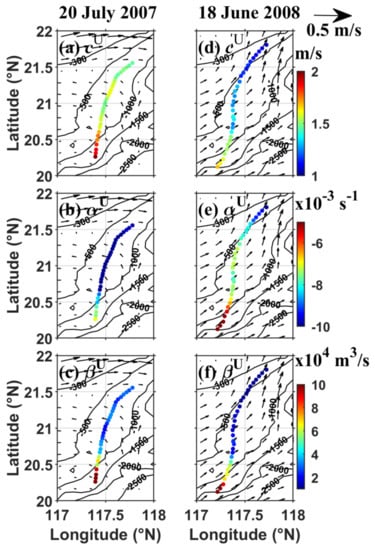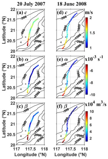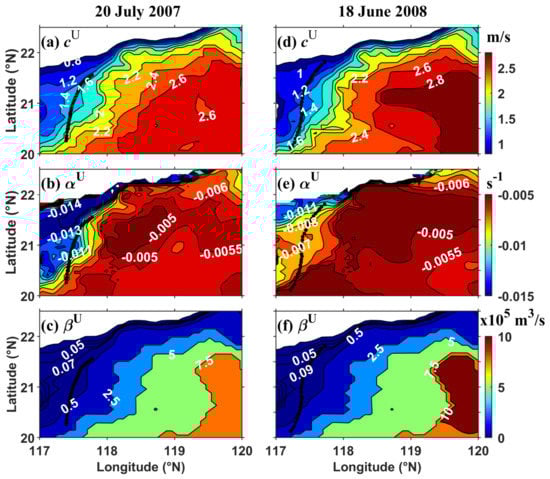 The local environmental parameters in Equation (2) have significant impacts on the behaviors of ISW evolution. Therefore, adopting the HYCOM reanalysis data near these two SAR-observed ISWs in the NSCS, these background environmental parameters given by (1), (3), and (4) are computed. Figure 3 first shows the distributions of linear wave speed , parameters and under no-shear conditions on 20 July 2007 and 18 June 2008, respectively. We can clearly see that in Figure 3a,d that the linear phase speed decreases from the southeastern to northwestern corner of the chosen domain. The general spatial variations in on these two days are similar, while at the eastern side of the domain is slightly larger for ~0.2 m/s on 18 June 2008. Additionally, the absolute values of the quadratic nonlinear parameter show a similar trend in increasing from the eastern side to the western side in Figure 3b,e. The variations in the values of between 117° and 118°E are distinctly larger on 20 July 2007. The distribution of the dispersion parameter in Figure 3c is roughly the same as that in Figure 3f. We notice that the linear wave speed and the dispersion parameter mainly depend on topography characteristics and have no significant temporal variation, just as depicted by Liao et al. [].