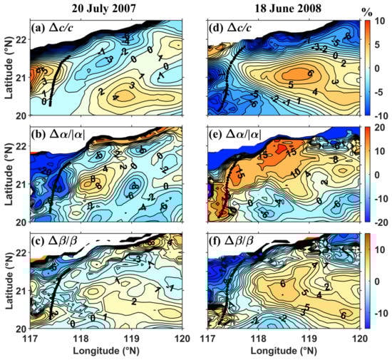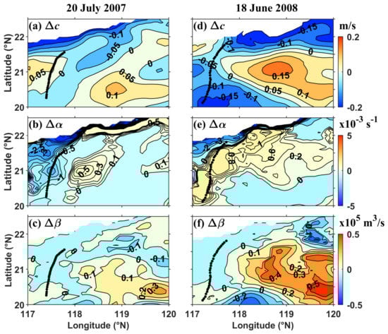 To better reveal the modulation of ambient shear on the environmental parameters of ISWs, the differences in these environmental parameters between shear and no-shear conditions are shown in Figure 5. Note that here, refers to the operation of results with shear subtracting those without shear (e.g., ). The variations in are roughly within m/s, which are close to shear on the scale. In addition, the sign of depends on the propagation direction of the ambient currents. Comparing Figure 2a (Figure 2b) with Figure 5a (Figure 5b), currents propagating westward lead to the increase in linear wave speed and vice versa. Basically, the nonlinear parameter changes by within in the majority of the computational region, while can reach a value of about in the northwest corner where the bottom topography is less 300 m (Figure 5b,e). The variations in reaches , as presented in Figure 5c,f. Furthermore, it is obvious that the distributions of shows more similarities with those of than , which is consistent with the relationship among distributions of , , and in Figure 3 and Figure 4. This further suggests that instead of is dominant in the calculation of the parameter (see Equation (4)).