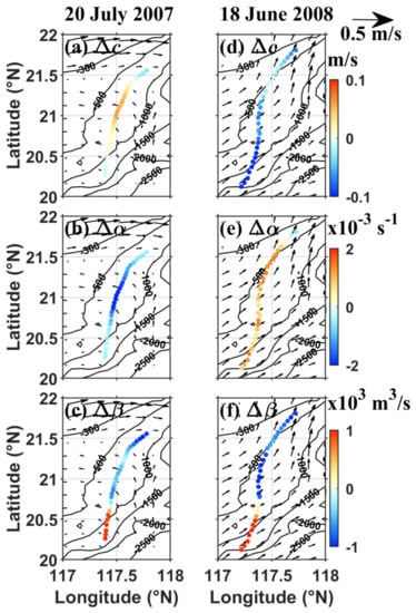 The changing rates of environmental parameters between shear and no-shear conditions in the chosen domain on 20 July 2007 (a–c) and 18 June 2008 (d–f); black-filled circles depict the different locations of ISW fronts.