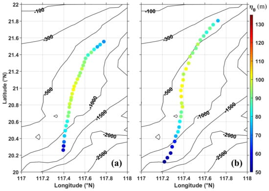 To extract amplitudes of ISWs from SAR images, the half-width of ISWs needs to be obtained first. The half-widths at 30 different locations of each ISW are calculated based on the approach adopted by Small et al. []. Figure 10 presents the surface current and bathymetry where SAR-observed ISWs occur, as well as the derived ISW half-widths along the ISW fronts. Obviously, the retrieved ISW widths along these two fronts are both broadened from the northern to southern end. The wave widths of ISW1 increases by 40% from the northern to southern end, while the spatial variation in wave half-width of ISW2 is appreciably larger, approximately increasing by a factor of 2.75 times from the northern to southern end. To date, several types of broadening have been reported and there are different mechanisms for the broadening of the ISW front. Zhao et al. attributed this broadening to the process of converting polarity due to bottom shoaling [,]. In this case, we associate the north–south broadening with the different transformation of ISWs across variable bottom topography in the NSCS deep basin, as proposed by Xie et al. []. Because of the spatial variations in the bottom topography, the absolute values of () decrease (increase) greatly in the northern part, while their variations in the southern part are relatively weak (Figure 3). Therefore, according to the expression , the wave width is overall narrower in the northern part than that in the southern part.