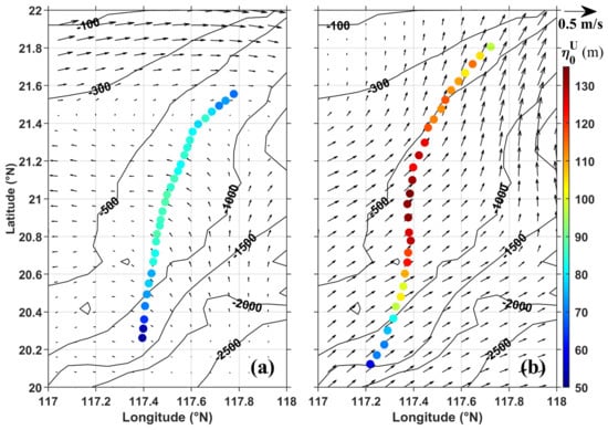 Amplitudes calculated under no-shear conditions along the ISW fronts and the surface current (black arrows; m/s) and bathymetry (black lines; m) near ISW1 on 20 July 2007 (a) and near ISW2 on 18 June 2008 (b).