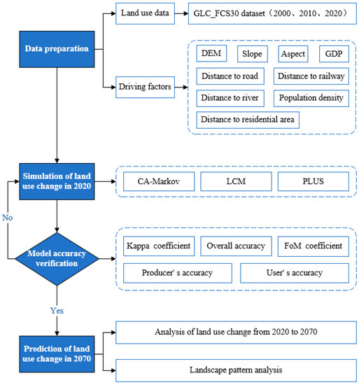 The technical route of the paper (Figure 2) includes four parts: data preparation, model simulation process, accuracy verification, and future land use prediction.
