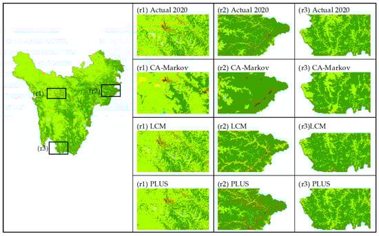 In order to establish a thorough query of the differences in the spatial distribution of simulated LUCC in detail, we select the northwest, northeast, and south of the Western Sichuan Plateau for local analysis (Figure 5). The simulation result of the CA-Markov model is the most diverse from the real data, and the simulation result of the LCM is closest to the actual 2020.