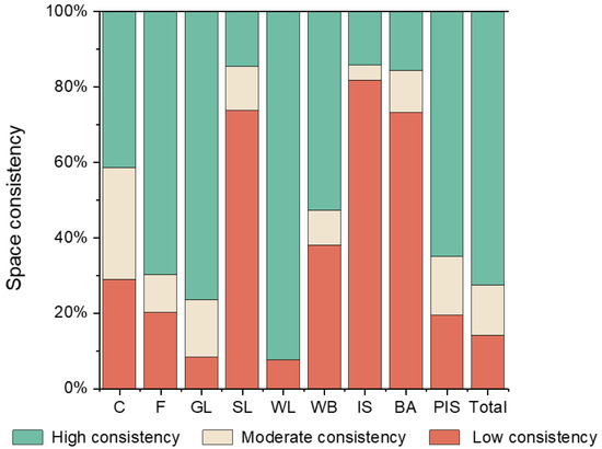 Percentage of the spatial consistency area of each land type. Full names of abbreviations are listed in Table 2.