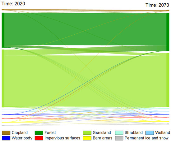 We can analyze the change in land types through the area and its proportion of the LUCC in 2070 (Table 4, Figure 8) and the sandy map of land-use transfer (Figure 9). Regarding area changes, the area proportion of C changes from 1.19% to 1.29%. F is the second largest land type in the study area, with the area changing from 90,879.52 km2 to 95,648.93 km2. By 2070, GL is still the largest land type, with an area of 143,113.50. The area ratio of SL increases to 0.12%. The area of WL in the region is the smallest, and the area accounts for only 0.01%. The area of the WB has risen 85.29 km2 in 50 years. The area ratioes of IS, BA, and PIS increases by 0.05%, 0.15%, and 0.38%. In terms of the direction of land type transfer, all land types have a tendency to change to different land types.