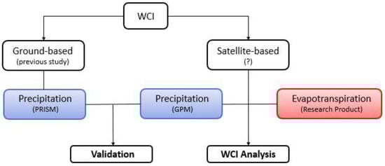 The main objectives of this study are twofold. (1) To develop a framework to test the ability of a remote sensing WCI by first evaluating the reliability of satellite products to estimate precipitation over the CONUS. Monthly PRISM and GPM IMERG precipitation estimates between January 2001 and December 2019 will be compared for different climates based on three metrics and a statistical test on their difference. (2) Upon successful completion of the first objective, calculate WCI changes between two separate multiannual periods (2001–2009 and 2010–2019), using the GPM precipitation product and the Elnashar et al. (2021) validated ET datasets (Figure 1).