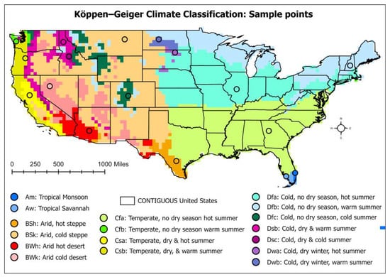 Present day (1980–2016) Köppen–Geiger climate classification map by [] showing 17 classes across the CONUS and the 17 randomly selected sample points for the first sample run.