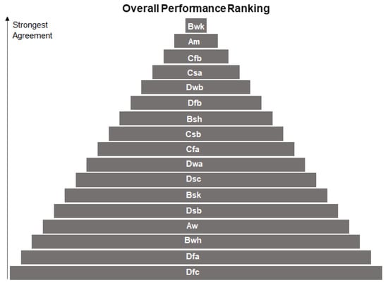 Ranking of the 17 climate classes based on relative agreements between the GPM and PRISM gridded precipitation products, according to R2, NSE, and KGE values.