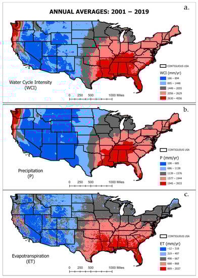 The average annual WCI between 2001 and 2019 varied across the CONUS. The west generally showed lower intensities, whereas the highest values were seen in the southeastern CONUS region. However, in the westernmost border around the western Washington region, values of over 4000 mm/yr were recorded (Figure 6a). Similar patterns were seen for both precipitation and evapotranspiration averages. Two essential ingredients for precipitation are moisture and lift. Thus, with the Gulf of Mexico as a potential supplier of moisture, combined with the existence of several mountain ranges in the region, it is no surprise that there is that much rain in the southeast region. Likewise, the active weather caused by the low-pressure system of the Aleutian Islands explains the excessive amounts of rain along the western boundary (Figure 6b). To illustrate the importance of available moisture for evapotranspiration, the areas with high precipitation (Figure 6b) appeared to also show relatively high evapotranspiration rates (Figure 6c).