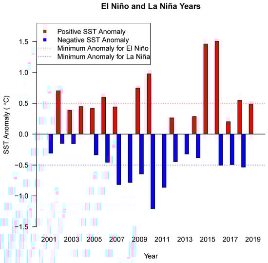 To calculate the differences, the averages of the first period (2001–2009) were subtracted from the second (2010–2019). Following the initial calculations, El Niño, and La Niña years (Figure 7) were then removed from the datasets based on average annual SST anomalies and a threshold of +/−0.5 °C. The El Niño years 2002, 2006, and 2015, and La Niña years 2007, 2008, and 2011 (Figure 7) were also identified in a different, independent study that compared average November-December-January (NDJ) and December-January-February (DJF) SST anomalies in the Niño 3.4 region with predefined threshold anomalies [].