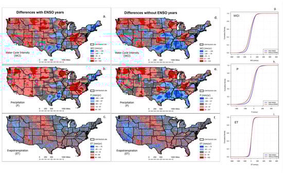 The west CONUS showed notable increases in WCI between both periods (Figure 8a), mostly due to increases in both precipitation and evapotranspiration in the second period (Figure 8b,c). However, our adjusted results (Figure 8d–f) show that during the period of study, ENSO impacted the WCI for the CONUS primarily by bringing more water to the southeast, west, and parts of the north and less water to the northeast regions.