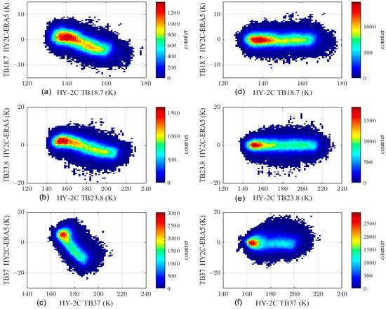 Diagram of OMB differences of HY-2C for each channel with respect to the calibrated TB on training dataset. (a–c): based on the APC method; (d–f): based on the neural network (x representing the calibrated TB and y the simulated one). Color denotes the number of points displayed in the color bar.