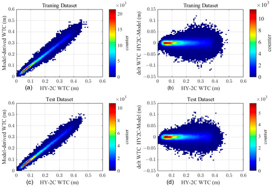 (a): HY-2C WTC versus model-derived WTC in training dataset; (b) HY-2C WTC versus WTC difference between HY-2C and model-derived WTC in training dataset; (c): HY-2C WTC versus model-derived WTC in test dataset; (d) HY-2C WTC versus WTC difference between HY-2C and model-derived WTC in test dataset; Color indicates the number of points displayed in the colorbar.