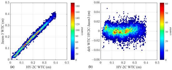 (a): HY-2C WTC versus Jason-3 WTC. (b) HY-2C WTC versus WTC difference between HY-2C and Jason-3.