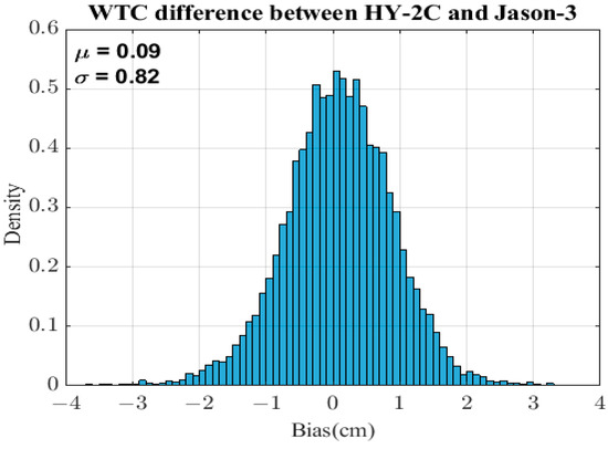 The mean deviation and the RMS between the HY-2C WTC and the Jason-3 WTC are 0.09 cm and 0.82 cm, respectively, and the correlation coefficient and R2 are 0.9959 and 0.9918, respectively. They all demonstrate that the HY-2C WTC has a good agreement with Jason-3.