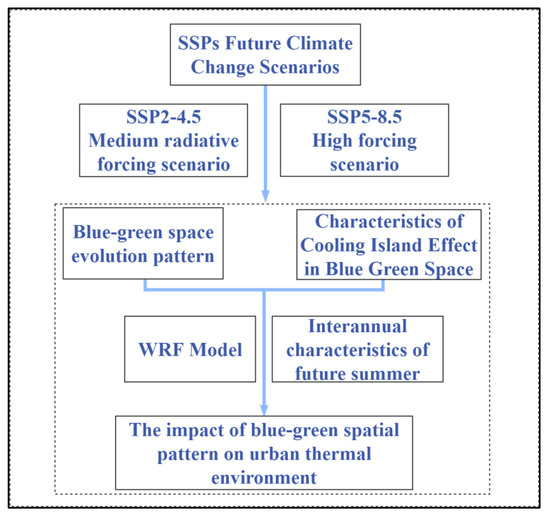 Although strategies such as increasing green cover or water bodies have been proposed to mitigate the UHI effect, there is a need to investigate their current efficiency and performance, especially their future projection of changes under different climate contexts. Specifically, it is necessary to establish a strong linkage and seamless integration between the projected future temperature and the characteristics of blue–green spaces (such as their size, structure, layout, etc.) to accurately assess the quantitative changes in the future UCI effect. The sixth phase of the new round of international coupled model comparison program provides rich and authoritative global climate model data for the field of climate change prediction. The SSPs’ scientific scenarios combine various processes (e.g., radiation forcing, socio-economic development, energy and land use change, greenhouse gas emissions, etc.) to analyze the relationship between socio-economic development and climate change response capacity. Thus, these SSP scenarios provide important data and a theoretical basis for assessing the impact and risk of climate change. In this study, we selected 15 kinds of CMIP6 global model data, including two combined scenarios (SSP2-4.5 and SSP5-8.5), to analyze the spatial-temporal evolution of the maximum temperature, average temperature, and minimum temperature in summer in the Northern subtropical zone from 2021 to 2100. Under different future SSP scenarios (Figure 1), we had the following aims: (i) The objective is to examine the spatiotemporal patterns of future temperature in the study area through simulations using Global Climate Models (GCM). This involves analyzing how temperature changes across different locations and time periods in the future based on the outputs of the GCM models. The focus is on understanding the distribution and variations of temperature over the study area under various future climate scenarios; (ii) The aim is to quantify the disparities in the UCI effect between two extreme future scenarios outlined in the Shared Socioeconomic Pathways (SSPs). Specifically, the goal is to assess and compare the impact of blue–green spaces (such as parks, green roofs, and water bodies) on mitigating the UCI effect in these scenarios. This entails measuring and analyzing the contrasting effects of blue–green spaces in reducing heat buildup and regulating local temperatures in the face of different future socio-economic and climate conditions; (iii) The objective is to evaluate the existing UCI conditions in the designed blue–green spaces within cities. This evaluation involves assessing the current effectiveness of these spaces in mitigating UHI effects, which refer to the phenomenon of higher temperatures in urban areas compared to surrounding rural areas. Additionally, the aim is to suggest the future potential of these blue–green spaces in further mitigating UHI effects amidst climate change. This assessment may include examining factors such as the design, location, and scale of the blue–green spaces, as well as their ability to provide cooling benefits and improve microclimate conditions within urban environments.