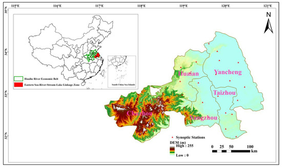 Since October 2018, the Huaihe River Ecological Economic Belt has been elevated as a part of a national strategy. The Eastern Sea-River-Stream-Lake Linkage Zone (ESLZ), which is part of the northern subtropical zone and includes Huai’an, Yancheng, Yangzhou, Taizhou, and Chuzhou, boasts natural location advantages (Figure 2). Except for Huai’an, the other four cities belong to the ESLZ’s world-class urban agglomeration, the Yangtze River Delta. The Yangtze River Delta is China’s fastest-growing economic region and has developed into one of the six greatest urban agglomerations globally, with particularly pronounced summer heat island effects. The ESLZ, driven by the development of world-class urban agglomerations, is unavoidably impacted by the growing UHI effect, becoming a typical area affected by the urbanization process and rapid urbanization in China. Being near the sea, the ESLZ has abundant water and green spaces that provide favorable conditions for studying the cooling island effect of blue–green space.