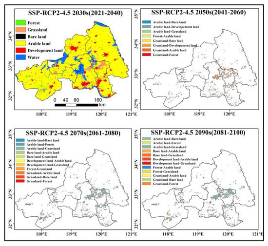 Spatial distribution of land use in the 2030s and change based on it under the SSP2-4.5 scenario.