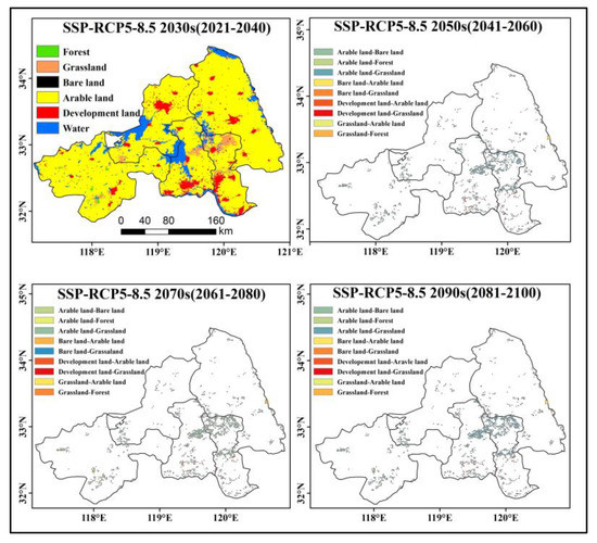 Under the SSP2-4.5 stable development scenario and the SSP5-8.5 high forcing scenario, significant changes are expected in different land use types in the blue–green space of the ESLZ over the next 80 years, as shown in Figure 3 and Figure 4 and Table 4 and Table 5. Specifically, under the SSP2-4.5 scenario, the forest and grassland areas are expected to decrease at a faster rate, with the total area decreasing by 0.17 × 103 km2 and 3.81 × 103 km2 by the 2070s. The arable land area increased at a steady rate and reached its maximum in the 2070s, with an increase of 3.66%. Since 2020, the water area has increased at a relatively constant rate, reaching 2.89 × 103 km2 in the 2050s, but it will not increase further in the subsequent period. Moreover, under the high forcing scenario of SSP5-8.5, the changes in blue–green space area are similar to those under the stable development scenario of SSP2-4.5. However, the forest area decreased faster, by 0.23 × 103 km2 in the 2070s, while the grassland area decreased at a slower rate, only by 3.35 × 103 km2 in the same period. The growth rate of arable land area was even slower, increasing by 3.14 × 103 km2 in the 2070s. The water area increased to 3.03 × 103 km2 in the 2050s and will not increase in the period after that. Overall, during the period of 2020 to 2080, the arable land area and grassland area can decrease greatly, while the arable land area can increase greatly. The overall area remained basically unchanged after the 2070s. The urban development land area has not changed since 2020, and the total area remains at 4.07 × 103 km2. Therefore, forest, grassland, and arable land are the most significant land use transfer patterns in the blue–green space of the ESLZ.