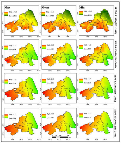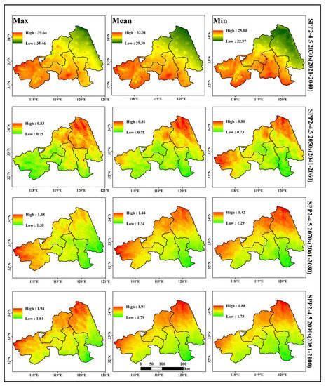 Considering the overall trend and spatial pattern of the land use temperature effect in the ESLZ, we observed a distinct divergence in the monthly mean temperature change attributable to land use during the summer season over the next 80 years (Table 4 and Table 5). In general, the most significant increase in air temperature caused by land use change was the maximum and could reach 1.51 °C. Land use change in the ESLZ is mainly represented by the transformation from forest land to arable land. In summer, forests use evapotranspiration to take away heat, leading to a smaller sensible heat flux and a significant cooling effect. However, when a certain scale of forest is transformed into arable land, more bare land is exposed, resulting in a lower latent heat flux and a higher sensible heat flux, leading to an obvious warming trend in the region. Therefore, the expansion of arable land areas will cause a regional warming effect. Due to the existence of large-scale forests and the conversion of grassland to arable land in this region, the increase in summer temperatures will be more significant.
