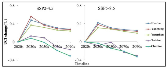 The paper utilizes future temperature data from 15 GCM under SSP2-4.5 and SSP5-8.5 scenarios to calculate the temperature changes between the future time periods (2030s, 2050s, 2070s, and 2090s) and the historical period (2020s). The difference in air temperature between urban development land and urban blue and green space is used to characterize the UCI intensity in the future. Figure 8 illustrates the changes in UCI intensity between the historical and future time periods (mean of 15 GCM predictions) for the two SSP scenario models, while Table 6 summarizes the intensity of UCI changes under the two scenarios. The UCI changes fastest between 2020 and 2030 in the historical period, and the change rate then becomes relatively stable. To emphasize the influence of other factors on UCI changes, this chapter focuses primarily on the UCI intensity changes between the historical period and the 2090s period. Among all cities analyzed in this study, Yancheng had the largest increase in UCI intensity (SSP2-4.5: 0.58 °C), while Chuzhou had the largest decrease (SSP5-8.5: −0.33 °C). The future UCI intensity of cities under SSP5-8.5 (12) is lower than that under SSP2-4.5 (15). It is expected that the UCI intensity of Huai’an, Yancheng, and Yangzhou will increase under both SSP scenarios, while the UCI intensity of Taizhou and Chuzhou will decrease under SSP5-8.5 scenarios. The indication of UCI intensity change depends on the SSP scenario in the analysis. Given that Huai’an City, Yancheng City, and Yangzhou City have abundant blue–green space, the UCI effect is more apparent under different SSP scenarios.