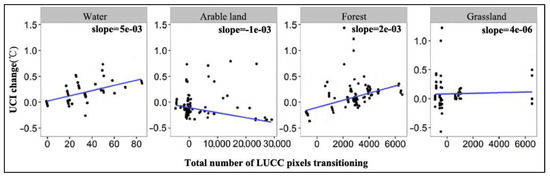 In order to study the relationship between future UCI intensity and land use change, this section derives the linear regression relationship between them and analyzes their amplitude change and statistical significance (p = 0.05). We generated scatter plots illustrating the relationship between changes in UCI intensity and the total number of pixels associated with each blue-green land use type in the historical time periods of the 2020s and 2090s. These scatter plots were obtained for various SSP scenarios (Figure 9). According to the figure, without expansion of urban development land, the mutual conversion of areas of different land use types in the blue–green space leads to a small change in the amplitude of UCI intensity in the future, while an increase in forest and water bodies shows a positive correlation with UCI intensity. However, an increase in arable land has the most significant impact on reducing the range of urban UCI. In the future, if UHI is caused by land use and climate change, it can be offset to a certain extent by increasing forest coverage, indicating that afforestation can effectively deal with the risk of increasing UHI intensity in the ESLZ.