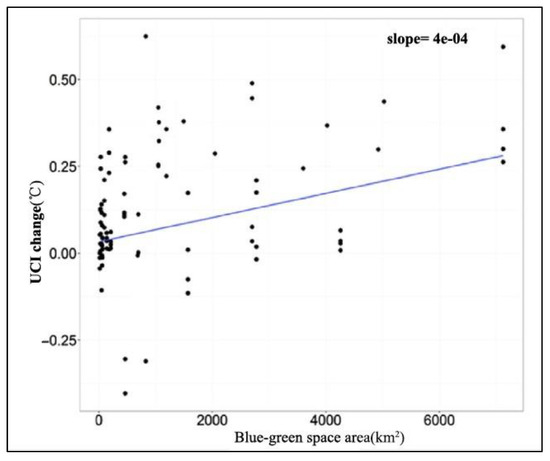 The scatter diagram in Figure 10 shows the relationship between UCI intensity and the size of urban blue–green space under different SSP scenarios. Our analysis reveals a notable positive correlation between the change in UCI intensity and the size of urban blue–green space. This suggests that cities characterized by larger blue–green spaces are likely to encounter a lesser decline in UCI in the future. Through evaluation and analysis of UCI changes in the ESLZ, it was found that five cities have experienced detectable UCI phenomena in the past. Cities with larger (or smaller) blue–green spaces will have larger (or smaller) increments of UCI amplitude in the future. The intensity of the UCI effect caused by changes in regional blue–green space area decreases from north to south, particularly in Huai’an City and Yancheng City.